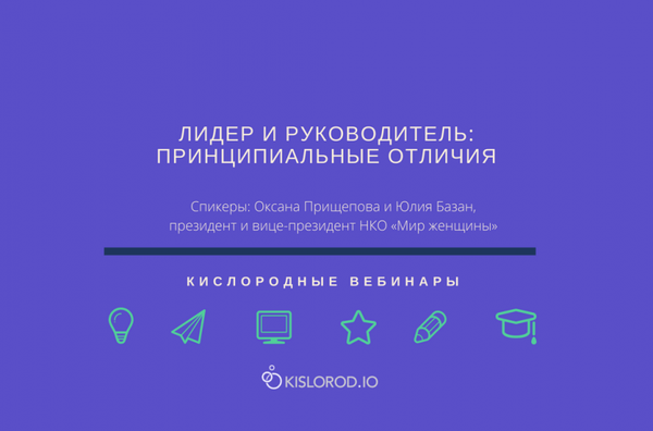 Что: Бесплатный вебинар образовательного веб-проекта Kislorod.io поможет лучше понять разницу между понятиями «лидер» и «руководитель», чтобы грамотно выстроить структуру организации. Ведущие вебинара — Оксана Прищепова и Юлия Базан — представители калининградской организации «Мир женщины», которая недавно отметила пятилетний юбилей. За это короткое время им удалось создать успешную команду активистов, реализовать большое количество социальных проектов, привлечь внимание общественности, а также получить ряд значимых премий и наград.
