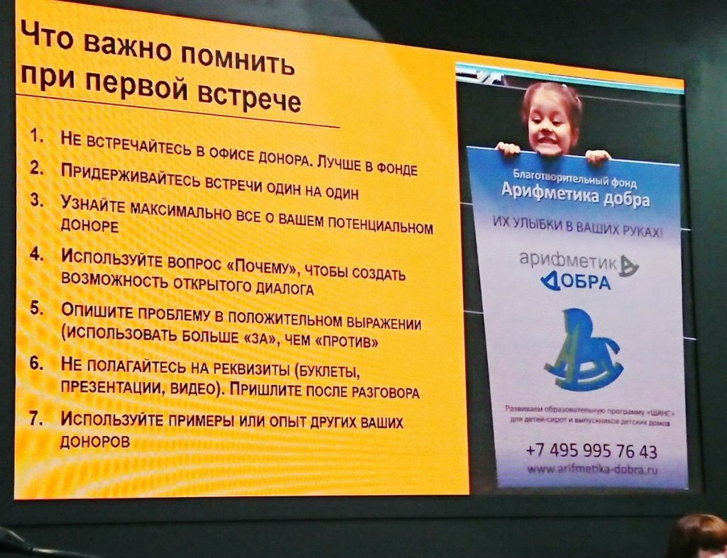 В качестве примера успешного фандрайзинга Анастасия рассказала случай из своей практики: «Когда я пришла в «Арифметику добра» (благотворительный фонд помощи детям-сиротам), мне нужно было привлечь 40 миллионов рублей. Я подумала: что люди делают чаще всего? Болеют. Где они чаще всего покупают лекарства? В тех аптеках, которые ближе всего к метро. Какая самая крупная аптечная сеть? «Горздрав». Я пришла в «Горздрав» и говорю: «Мне не нужны ваши деньги, мне нужны ваши полки. Давайте сделаем акцию: просто повесьте мой логотип и напишите: «1 рубль с этой полки идёт на благотворительность».