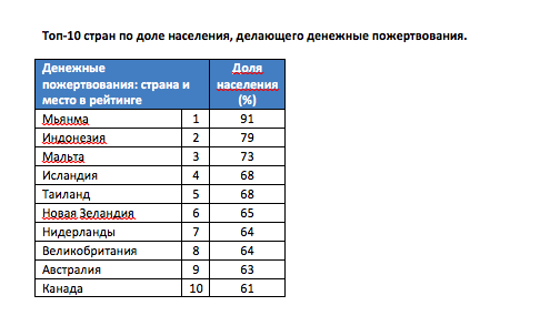Россия поднялась на несколько пунктов в Мировом рейтинге частной благотворительности