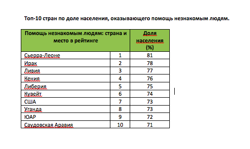 Рейтинг составляется по данным опроса компании Gallup, анализируется поведение людей за последний месяц. Место страны в рейтинге зависит от среднего значения по трем показателям:
