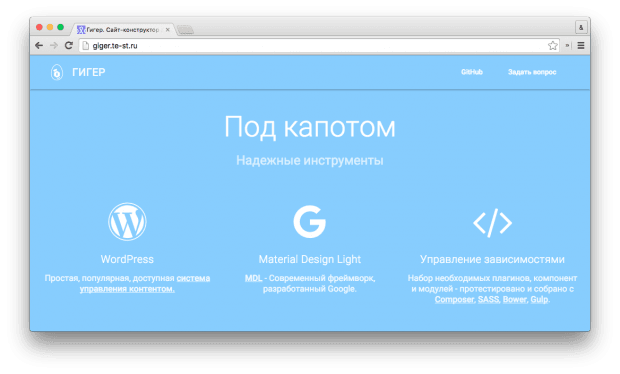 «Гигер» – это полноценный набор инструментов с открытым исходным кодом (GitHub), который включает в себя WordPress с уже установленными необходимыми плагинами (Онлайн-Лейка) и темами, заполненными страницами сайта, а также современный фреймворк Material Design Light и набор плагинов для управления зависимостями (Composer, SASS, Bower и Gulp).