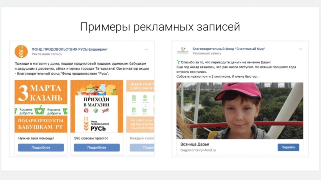 Например, вы создали какой-то продукт – классный мультфильм для детей четырнадцати-восемнадцати лет, с помощью которого можно поговорить с ними о профилактике гепатита. Вы создали классный материал – «ВКонтакте» готов помочь вам в его продвижении.