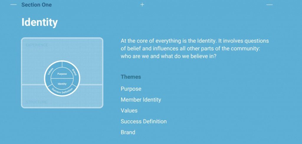 У структурированных сообществ есть ясное понимание того, почему сообщество существует и чего добивается. Ответы на эти вопросы влияют на все остальные части сообщества, и именно поэтому идентичность — это ключевой раздел.