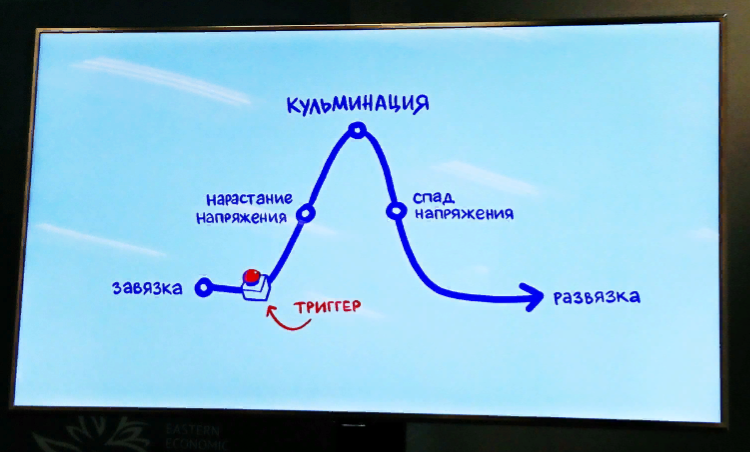 2. Также в истории должна быть кульминация и развязка. Должно нарастать напряжение. Почему нарастает напряжение? Герой что-то делает, но у него не получается. Герой встречается с какими-то препятствиями. Есть некий конфликт. Герой входит в него и выходит другим, измененным.