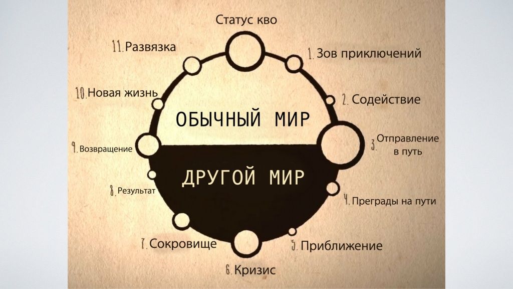 Мир в этом рассказе разделяется на две части – обычный мир и некий особый, специальный мир. В начале истории герой находится в положении «статус кво», потом каким-то образом его зовут на приключения (например, Люси из «Хроник Нарнии» залезает в шкаф), и герой внезапно попадает в другой мир, необычный (Нарния). Этот мир наполнен опасностями и преградами (например, слуги злой Колдуньи, тролли, гоблины, нападение волков и пр.) Преодолевая преграды, герой продвигается к своей цели (например, убить злую колдунью или расколдовать принцессу). В какой-то момент наступает кризис: герой либо умирает, чтобы потом воскреснуть, либо оказывается на волосок от гибели, либо теряет все (если это не сказка, а какая-то социальная драма, например). Но в конце концов он преодолевает кризис и получает сокровище. Очень часто это сокровище оказывается не тем, на которое он рассчитывал изначально. Возможно, он не получает материальную выгоду, но он что-то узнает о себе, о мире, о других людях, и именно это оказывается для него настоящим сокровищем. После этого он возвращается в обычный мир, наступает жизнь после приключений, и дальше следует развязка.