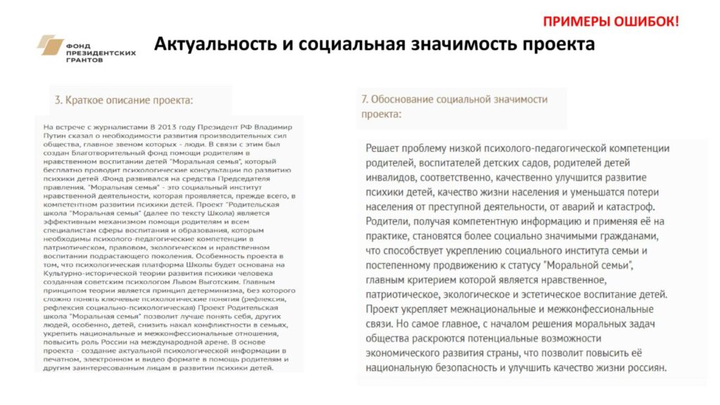 В заявках часто говорится об общемировых ситуациях, словах президента, мировых тенденциях. Эксперты, однако, ждут описания конкретной проблемы в конкретном регионе и рассказа о том, как ее решает проект. Эксперты ждут статистики и отсылок к исследованиям социальной среды в регионе — а вместо этого получают общие фразы и размытые заявления.