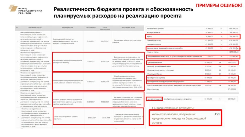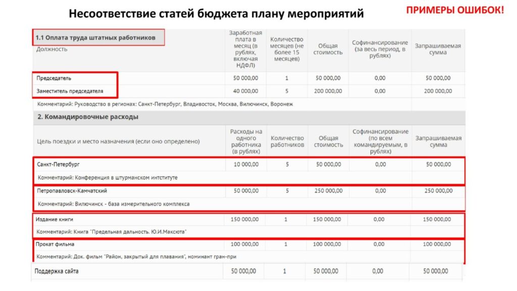 Со статьей, описывающей бюджет, оказалось больше всего проблем. Ошибкой считалось, если там оказывались расходы на что-то, чего нет в плане, или если вместо конкретного указания статьи расходов были расплывчатые формулировки «на продвижение в СМИ и в социальных сетях».