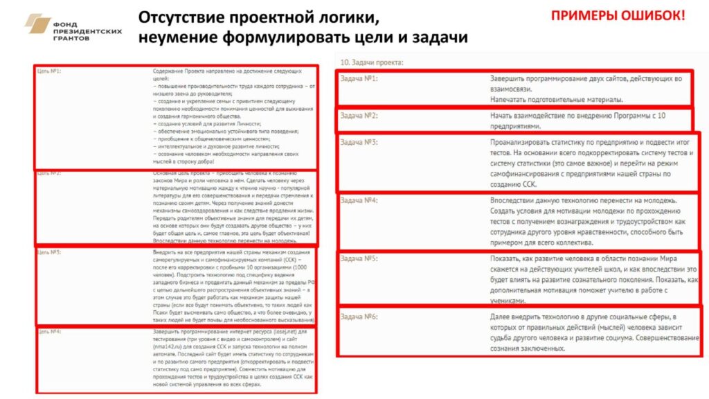 Проблемы с размытыми формулировками есть и здесь: цель должна быть короткой, внятной и понятной. Распространенная ошибка — нарушение логики. Мероприятия в заявке не решают задачи проекта и приводят в итоге совсем не к заявленной цели.