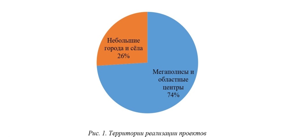 Контент-анализ отечественных информационных ресурсов (период публикации: 2020-2023 гг.) показал, что инициативы, направленные на продвижение идей наставничества, можно обнаружить в самых разных субъектах страны. Подавляющее большинство проектов (74%) реализуется в мегаполисах и областных центрах, остальные 26% – в небольших городах и сёлах (см. рис. 1).