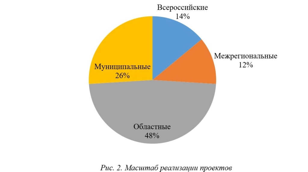 Что касается масштабов реализации проектов, то 14% – всероссийского масштаба, причем они могут быть частично и международными (например, если находятся в приграничной полосе с государствами СНГ), 12% – межрегиональные, 48% – областные, 26% – муниципальные (см. рис. 2).