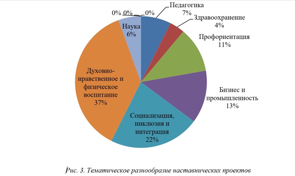 ⇒ Духовно-нравственное и физическое воспитание («Папина школа», «К истокам нравственности: духовное наставничество в Оренбургском крае», «Православный библиогид: наставнический центр для кафедр православной литературы библиотек Смоленщины», «С русским воином через века». «Школа детского туризма: наставничество в действии», «Подарок наставника потомкам», «Альпинист-наставник», «Школа Акел» и др.) – 37%;
