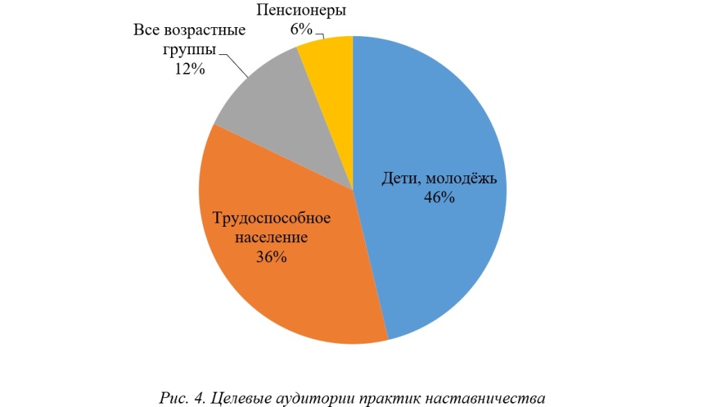 Целевыми аудиториями и благополучателями большинства инициатив являются дети, подростки и молодёжь, на трудоспособное население (от восемнадцати лет) ориентированы 36% практик наставничества, 12% предназначены для всех возрастных групп населения, 6% нацелены на пенсионеров (см. рис. 4). При этом целевые аудитории примерно трети проектов неоднородны и охватывают, например, детей-сирот и их наставников, будущих и действующих педагогов или студентов и бизнесменов, что обусловлено спецификой инициатив, заключающейся в передаче опыта в какой-либо сфере.