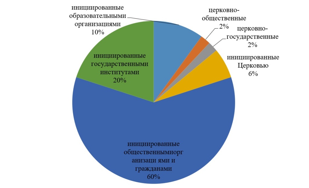 Большинство выявленных в интернет-пространстве практик инициировано общественными организациями и гражданами (60%), государственными институтами реализуется 20% проектов, образовательными организациями – 10%, 6% практик инициировано Церковью, ещё 2% можно отнести к церковно-общественным, другие 2% – к церковно-государственным (см. рис. 5).
