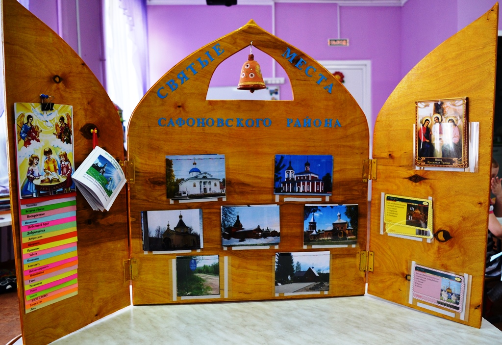Одним из первых мероприятий проекта «Модель духовно-нравственного воспитания в дошкольном учреждении», выигравшего грант конкурса «Православная инициатива 2019-2020», стала реализация мини-проекта по созданию игрового пособия «Святые места Сафоновской земли». Пособие содержит несколько информационных разделов: храмы города, района, святые источники, православные иконы, книжка-малышка «Правила поведения в храме», сборник православных стихов для детей, а также два кармана со сменной информацией об устройстве храма, православных праздниках, традициях и т.д.