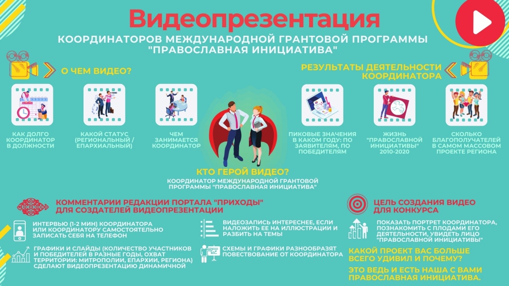 Для тех, кто хочет принять в конкурсе региональных и епархиальных координаторов Международной грантовой программы «Православная инициатива», была созданная памятка, призванная облегчить работу над видеопрезентацией, которая будет представлена на суд жюри. Конкурс проводит портал «Приходы».