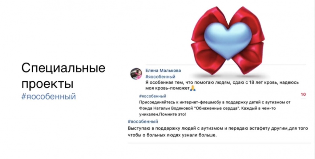 К этому же дню был реализован еще один специальный проект – «#яособенный». Акция проводилась совместно с Фондом Натальи Водяновой «Обнаженные сердца». Сеть «ВКонтакте» предложила своим пользователям рассказать, в чем они особенные. Ведь какие-то особенности есть не только у людей с расстройством аутистического спектра, но и у каждого из нас.