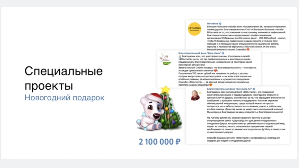 В этом проекте было собрано более 2 миллионов рублей, однако его главная цель более широкая – привлечь к добрым делам как можно больше людей, ведь осознание, что они помогают, уже в какой-то мере вводит пользователей соцсети в благотворительность.