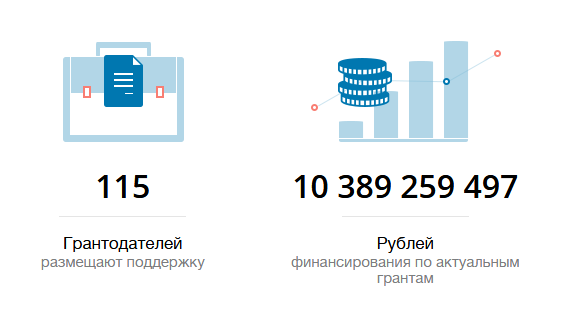 На данный момент он содержит информацию о 203 конкурсах и 5406 федеральных, региональных и частных грантах. Кроме того, здесь представлены презентационные страницы 115 грантодателей из 85 субъектов Российской Федерации. На портале уже зарегистрировано 135 пользователей.