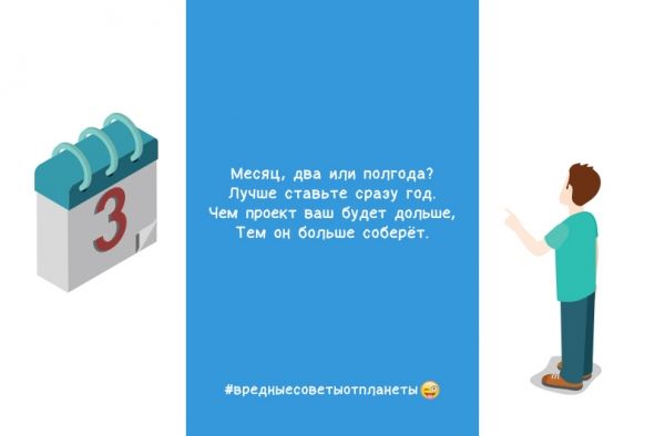 Спонсоры проектов часто откладывают участие в крауд-кампании на потом, когда видят, что до окончания проекта остаётся ещё много времени. Но «потом» они могут и не вернуться. Затянутая крауд-кампания отнимет много сил автора. Безусловно, для проектов с большими финансовыми целями допустимы продолжительные сроки. Благотворительные проекты на Planeta.ru можно продлевать несколько раз. Но руководители благотворительных проектов рекомендуют разделить финансовую цель на количество дней и получить ежедневный KPI. Комфортна ли итоговая сумма для человека, который будет заниматься проектом? Не стоит забывать и о сезонности. Для некоторых проектов очень важен период сбора.